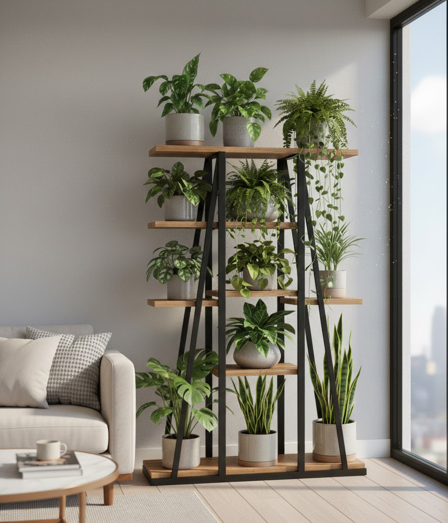 • Styling Tip: Place your “sun-hogs” (like Succulents) on the top tier and shade-loving plants (like Ferns) on the bottom. To get that Urban Jungle aesthetic, choose a stand with varying heights to create a “jungle staircase” effect.