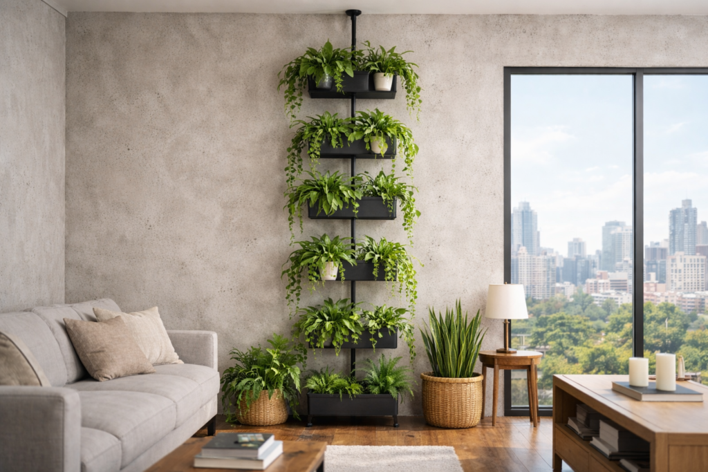 You don’t need to drill into your walls to create a lush, floor-to-ceiling green wall. By using floor-to-ceiling tension poles, freestanding tiered plant stands, and over-the-door organizers, you can maximize your vertical space while keeping your security deposit 100% safe. This guide covers the best no-drill plant wall hacks for renters and small-apartment dwellers.